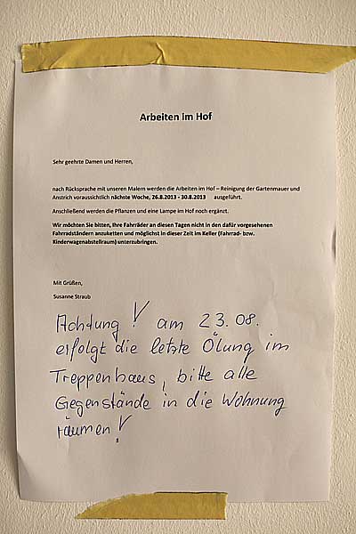 Ojeoje - Die letzte Ölung +++ [24.08.2013] Der neue Putz hat nix genutzt. Über Jahre hinweg wurde die Gravelotte 11 renoviert, saniert, umgebaut. Aus den alten einfachen Arbeiterwohnungen des 19. Jahrhunderts ist nach Abschluss der in den letzten aufregenden Jahren der Renovierungs- und Umbauarbeiten, aufgehübschter (man spricht von mehr als 5.000 Euro/qm teurer) Wohnraum entstanden, bisweilen sogar mit gold-glänzenden Wasserhähnen und Stuckapplikationen an der Decke. Zugegeben: Das Haus hat schon mehr als 120 Jahre auf dem Buckel, ist auf nassem Fundament gebaut, die Hauswände sind mit groben Isarkies gefüllt und erst vor kurzem drohte die Küche im ersten Stock einzubrechen. Aber damit hatten wir im Ernst nicht schon jetzt gerechnet: "Achtung, letzte Ölung!" Für den 23. August 2013 war dieses (meist letzte) Sterbesakrament per Aushangzettel im Hausflur angekündigt. Ein Fünkchen Hoffnung noch... Aber vielleicht wird die Gravelotte 11 ja doch noch nicht das Zeitliche segnen. Ein kleines Flämmchen der Hoffnung brennt noch. Denn glaubt man den Zeilen im Buch Jakob 5, 14-15, dann soll die sakramentale Salbung nicht ein Ritus aufgrund des sicher bevorstehenden Todes, sondern ein Mittel zur Stärkung und Ermutigung sein. Nach der auf der Grundlage des Zweiten Vatikanischen Konzils basierenden und später durch die Apostolische Kostitution „Sacram Uctionem Infirmorum“ im Jahr 1972 modernisierten Deutung ist die Salbung für jene bestimmt, „die sich wegen Krankheit oder Altersschwäche in einem bedrohlich angegriffenen Gesundheitszustand befinden.“ Das Sakrament könne, auch wenn es immer noch volkstümlich „letzte(!) Ölung“ genannt wird, durchaus wiederholt empfangen werden. Dann nämlich, wenn sich der Existenz bedrohende Zustand zwischenzeitlich erholt hatte und später erneut das Ableben drohe. Alle Sünden vergeben? Wenn die letzte Ölung der Gravelotte 11 tatsächlich als liturgiegetreues römisch-katholisches Ritual umgesetzt wurde, kann das auch durch einen interessanten Nebeneffekt motiviert gewesen sein, den das Haus - und stellvertretend seine Besitzer - möglicherweise für sich nutzen wollten. Denn: Von oberster Stelle werde verziehen, was immer sie gesündigt haben: „Durch diese heilige Salbung und seine mildreichste Barmherzigkeit lasse dir der Herr nach, was immer du gesündigt hast. Amen.“ So zumindest lautet die Formel der aktuellen Liturgie. Aber ging wirklich alles mit Rechten Dingen zu? Papst Pius VI legte in seiner Approbation nämlich auch fest, dass die heilige Salbung zwingend nur durch einen Priester erfolgen dürfe. Der jedoch wurde am besagten 23. August 2013 nicht im Haus gesichtet. +++